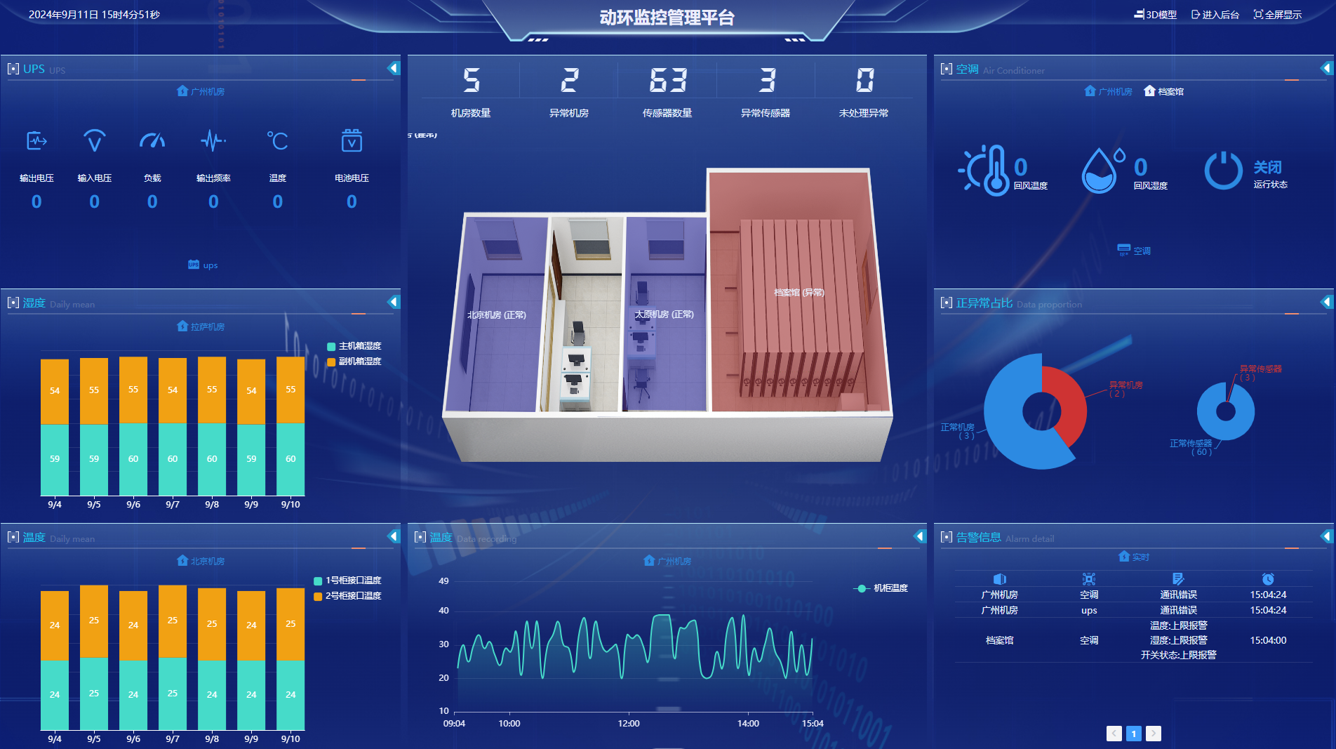 5、環(huán)境系統(tǒng): 精密空調(diào)、泄漏、溫度、濕度、新風(fēng)機(jī)、氣體、塵埃;精密空調(diào):監(jiān)測(cè)回風(fēng)溫度/濕度等參數(shù),壓縮機(jī)、風(fēng)機(jī)、加濕器、去濕器等部件的狀態(tài),控制空調(diào)的啟停,調(diào)節(jié)溫度和濕度。普通空調(diào):通過對(duì)其控制電路的分析,可實(shí)現(xiàn)對(duì)普通空調(diào)的狀態(tài)監(jiān)測(cè)和啟??刂?。新風(fēng)機(jī):新風(fēng)機(jī)工作狀態(tài)監(jiān)測(cè)以及啟停控制。溫濕度:監(jiān)測(cè)各房間溫濕度傳感器所采集的溫度和濕度數(shù)據(jù),并越限報(bào)警。