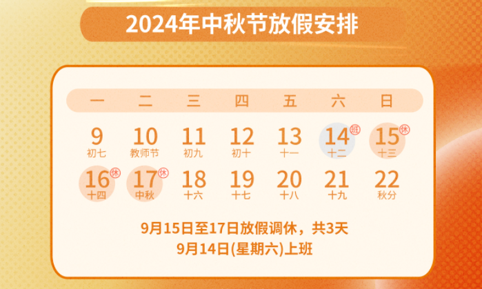 根據(jù)國家節(jié)假日安排,結合我司實際情況,中秋節(jié)假期定于9月15日至9月17日(共計3天),9月18日(星期三)恢復正常上班。請各位同事提前做好工作對接,確保假期期間公司業(yè)務的平穩(wěn)運行。