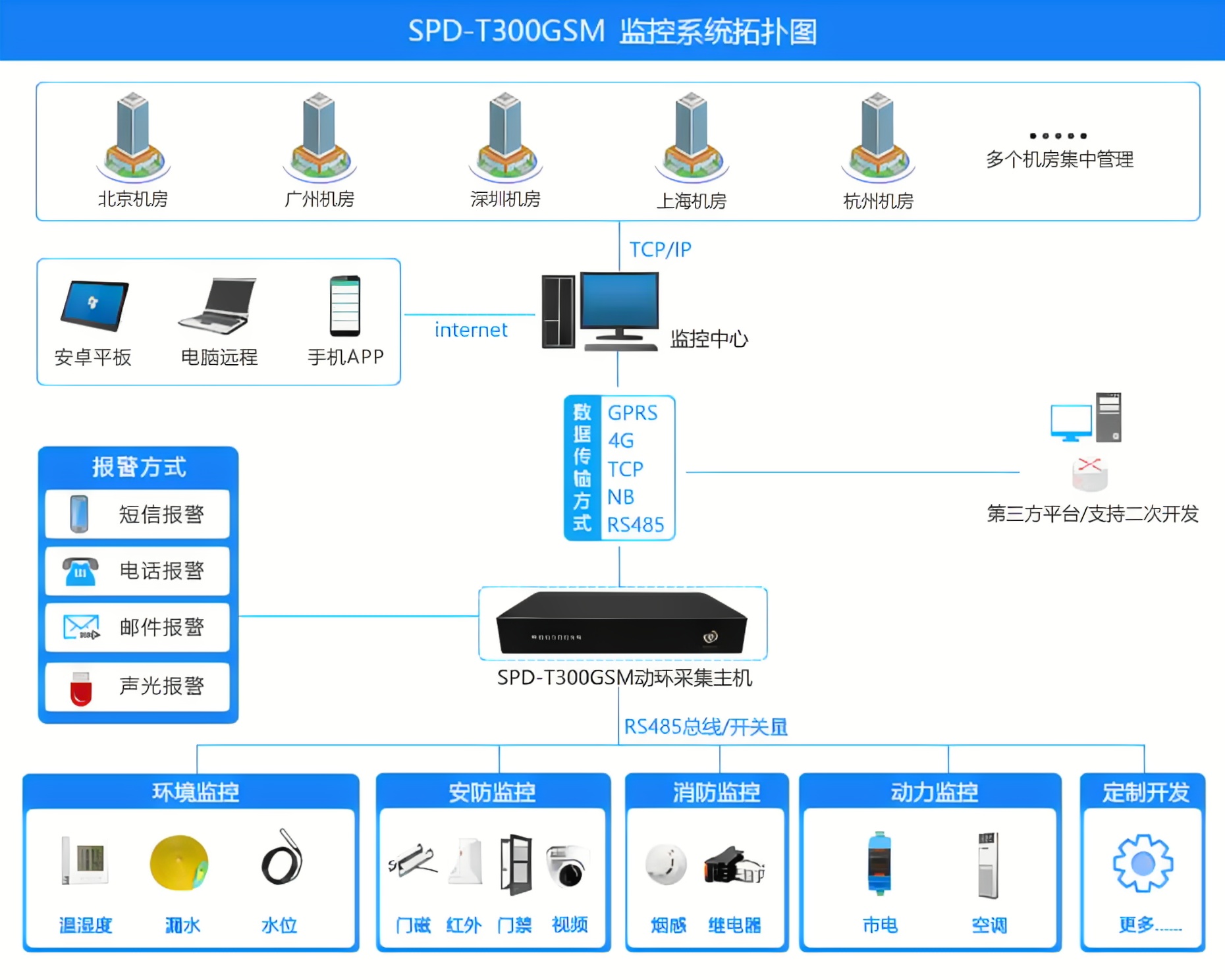 動力環(huán)境監(jiān)控系統(tǒng)常規(guī)功能首先涵蓋了全面監(jiān)測,如織就一張細(xì)密無間的安全網(wǎng),對電源UPS、電池組、三相電、市電、空調(diào)、溫濕度、門禁、視頻、水浸、消防等關(guān)鍵要素進(jìn)行24小時(shí)不間斷的監(jiān)控,任何細(xì)微波動都難逃其法眼。而其智能告警功能如同敏銳的哨兵,一旦發(fā)現(xiàn)異常狀況,立即通過APP、微信、電話、聲音、短信、郵件等多種方式向管理人員發(fā)出緊急警報(bào),確保問題能夠被迅速發(fā)現(xiàn)并處理,有效避免潛在風(fēng)險(xiǎn)升級為實(shí)際故障。
