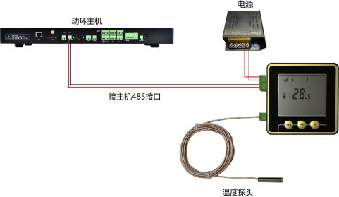 1.溫度傳感器上有DC12V、RS485①、開關(guān)量輸入、溫度傳感器,有4個(gè)接口。