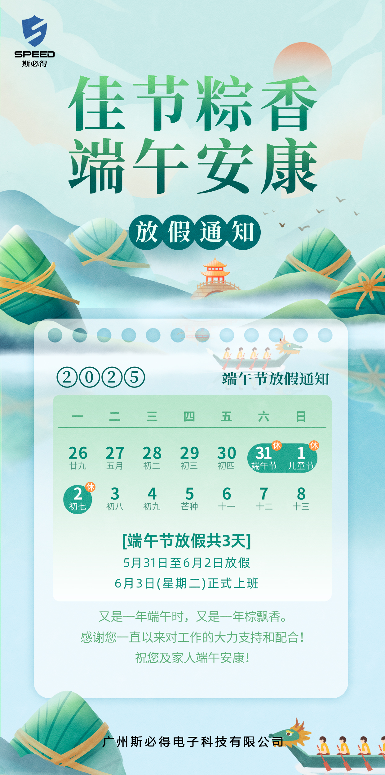 廣州斯必得2025年端午節(jié)放假安排,根據(jù)國(guó)務(wù)院辦公廳發(fā)布的《關(guān)于2025年部分節(jié)假日安排的通知》,今年端午節(jié)從5月31日(周六)至6月2日(周一)放假,一共3天。
