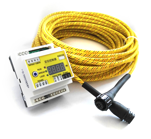 當(dāng)感應(yīng)線被泄漏物浸泡,則二根導(dǎo)電聚合物(黑色傳感線)之間被短接,并使所測(cè)電流值發(fā)生變化,控制器根據(jù)歐姆定理,電阻與長度有關(guān),通過測(cè)算,就能得到發(fā)生故障泄漏點(diǎn)的位置
